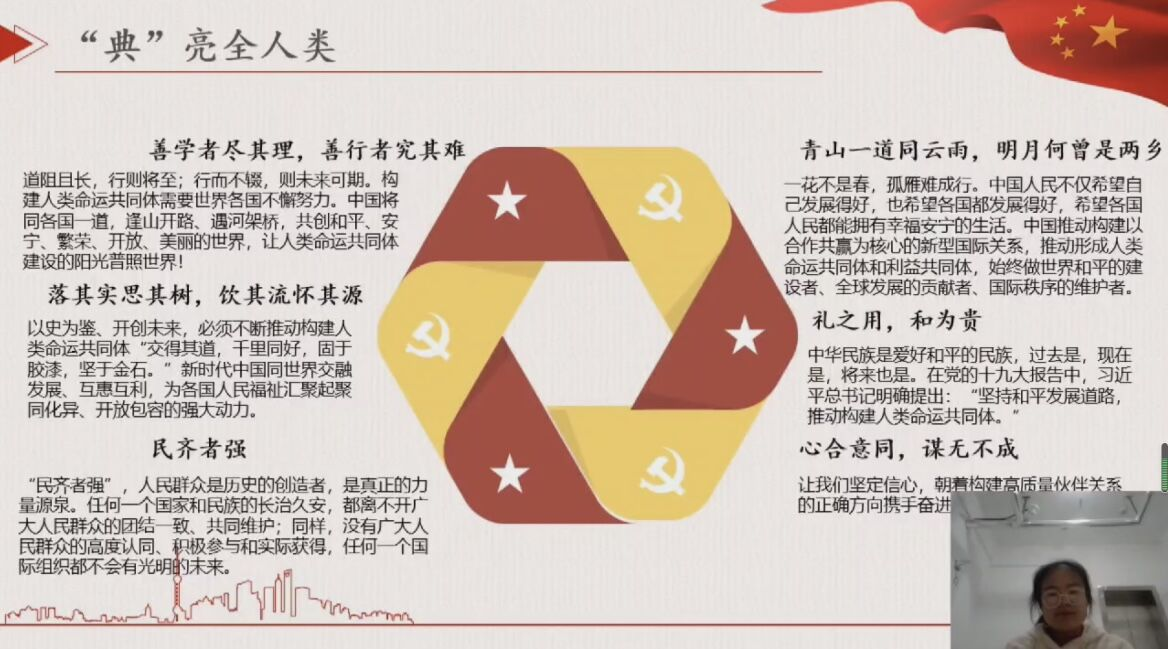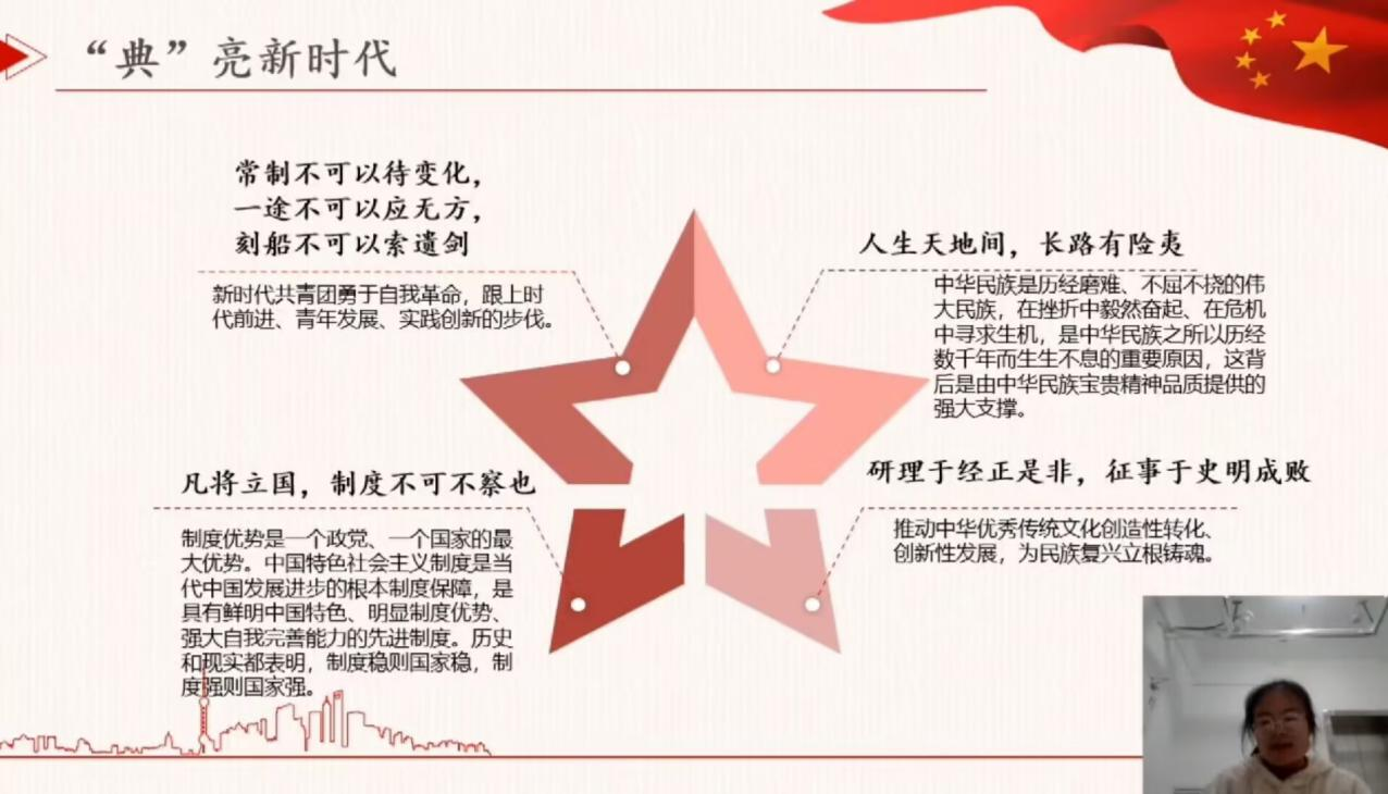 自二十大召开以来,幸运飞艇 就“二十大小课堂”活动面向幸运飞艇 学子征集作品。本次活动以线上讲课的方式进行,讲课内容围绕党的二十大精神并与中华优秀传统典籍相结合,通过对中华典籍加以解读,进而引向“党的二十大精神”。同学们通过作品积极地传达了对党的二十大见解与认知,更加深入的了解到中国优秀传统文化与党的二十大精神的内在联系。