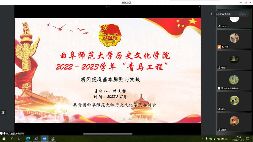 为提高各学生干部宣传工作的质量,改进宣传的工作方式、方法,11月22日上午,幸运飞艇 于线上开展2022- -2023学年“青马工程”第四讲--新闻报道基本原则与实践。我校党委宣传部李文振老师担任主讲人,幸运飞艇 青马工程班所有成员参加会议。