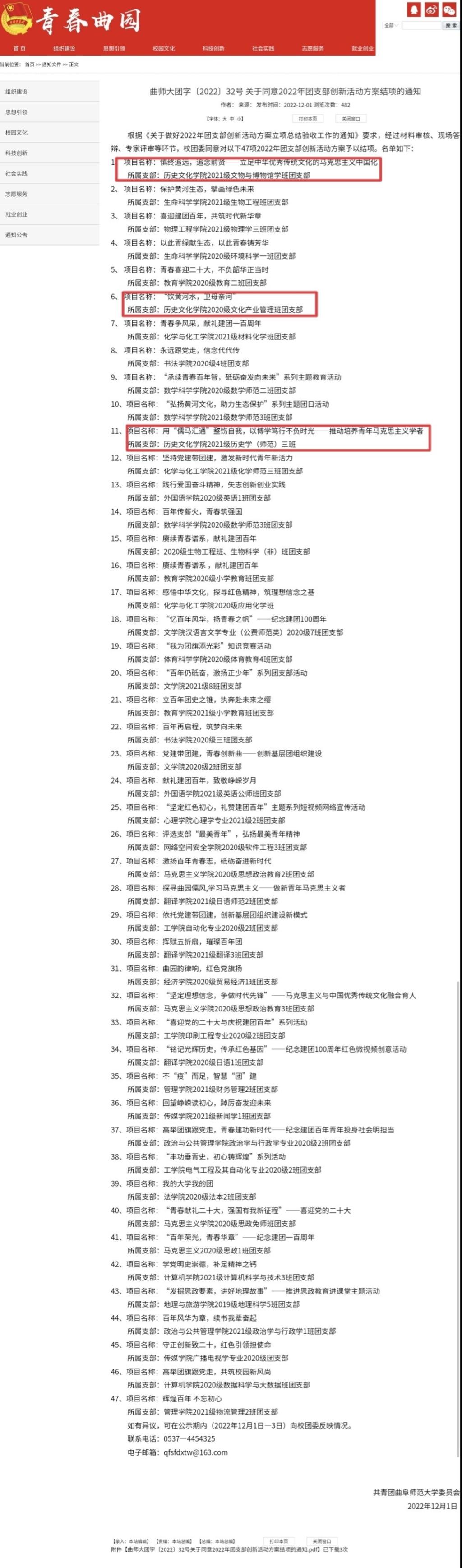 幸运飞艇 2020级文化产业管理班团支部项目“饮黄河水,卫母亲河”、2021级文物与博物馆学班团支部项目“慎终追远,追念前贤——立足中华优秀传统文化的马克思主义中国化”、2021级历史学(师范)三班项目“用‘儒马汇通’整饬自我,以博学笃行不负时光——推动培养青年马克思主义学者”均结项成功。