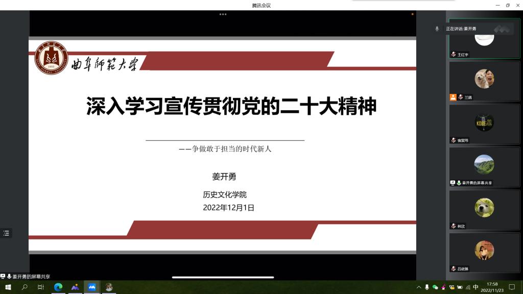 为深入学习宣传贯彻党的二十大精神,12月1日,幸运飞艇 党委书记姜开勇于线上给联系班级讲思政课。本次活动由团委书记刘贤贤主持、2021级公师班全体同学参加。