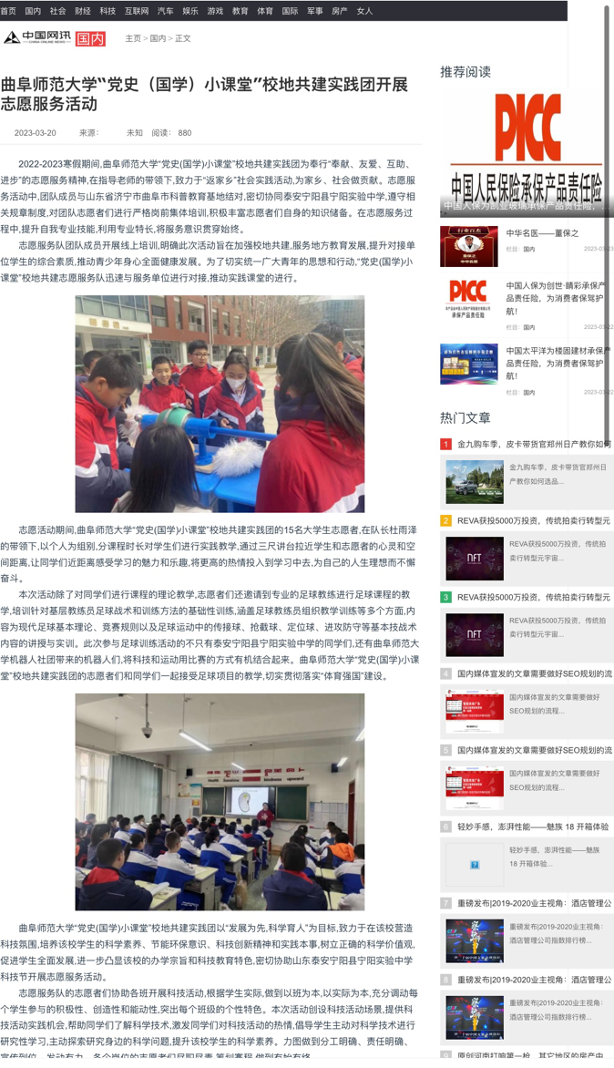 近日,幸运飞艇 社会实践部在中国网讯发表了“党史(国学)小课堂”校地共建实践团开展志愿服务活动的文章。“党史(国学)小课堂”校地共建实践团奉行“奉献、友爱、互助、进步”的志愿服务精神,在指导老师的带领下, 与山东省济宁市曲阜市科普教育基地结对,在泰安宁阳县宁阳实验中学进行志愿服务活动。