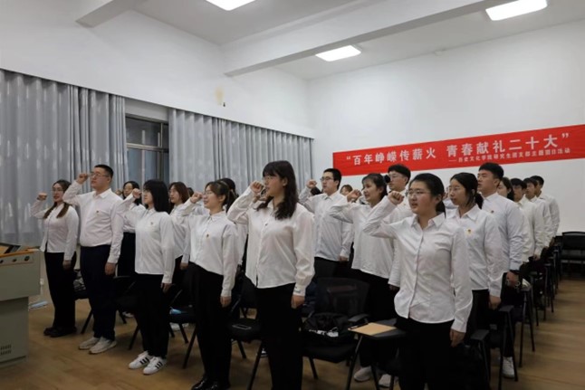 在本次活动中,首先由王景鹤同学带领团员们庄严宣誓,高唱团歌,与团旗合影。随后,王瑾同学上台分享自己与共青团的故事,为新团员颁发团徽、团员证。最后,王瑾同学对新团员们表示衷心的祝贺和勉励,并指出新团员要学习团的章程,传承团的精神,坚定拥护中国共产党领导。