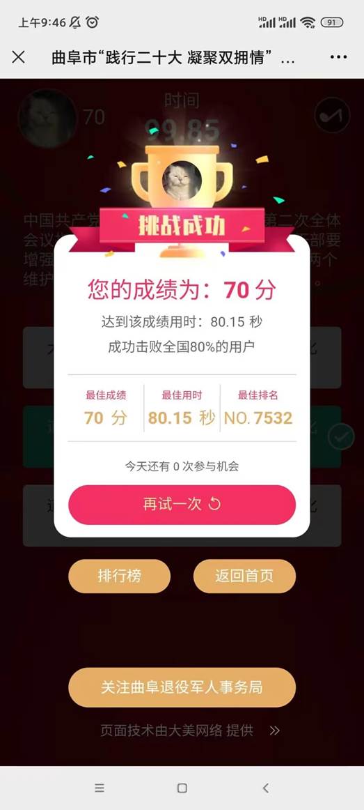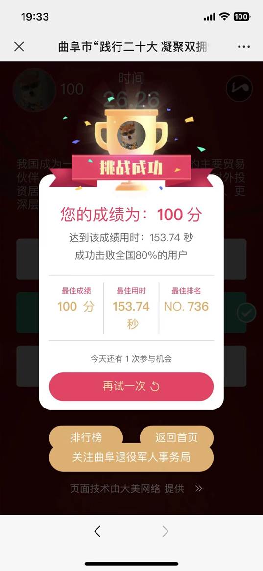 为支持国防和军队建设,普及国防双拥知识,增强双拥工作活力,增强新时代双拥共建工作的使命感、责任感,3月14至4月14日,幸运飞艇 积极参与曲阜市“践行二十大凝聚双拥情”双拥知识竞赛答题活动。