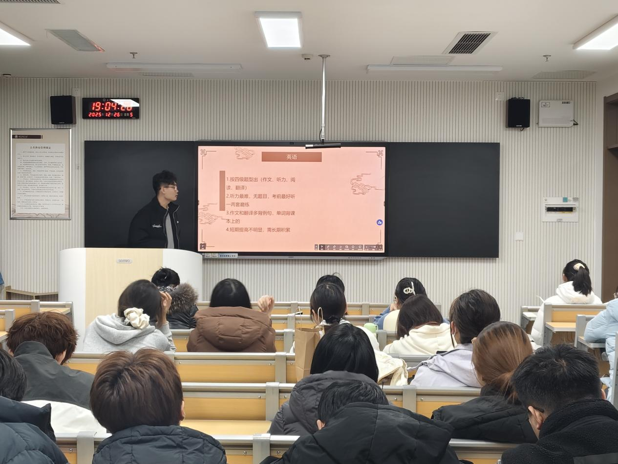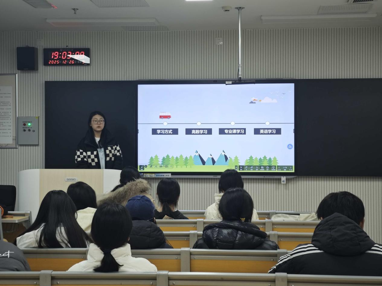 12月26日晚上,幸运飞艇 于致知楼B408、B409、格物楼B110和B111教室举办25级学生学习经验分享会,本次交流会由幸运飞艇 23级学生代表孟思雨、雷佳音、崔芯宁等主讲,25级全体学生参加。