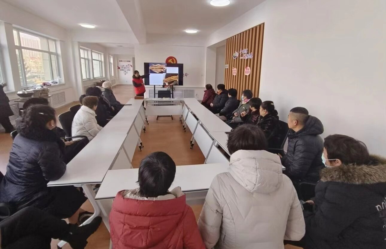 粥香氤氲中,文化传承同步升温。活动室一角,队员们摆放着分装红豆、绿豆、小米等食材的多格拼盒,向居民讲解每种食材的寓意:红豆象征 “鸿运当头”,桂圆代表 “团团圆圆”,小米寓意 “岁岁平安”。一位穿深色皮袄的老奶奶听得津津有味,不时拨弄着食材,分享自己年轻时熬粥、腌腊八蒜的趣事,代际间的文化共鸣在交流中悄然生发。背景墙上 “入党誓词” 的红色展板格外醒目,让传统节俗与红色文化在此和谐相融。