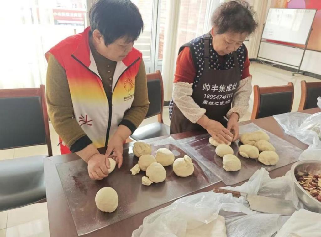 在制作现场,队员们与居民们并肩协作,没有校园与社区的界限,没有年龄与身份的隔阂。有的队员负责揉面塑形,将切分好的面剂反复揉搓,力求每一个面团都光滑匀称;有的队员协助整理食材,将红枣、面点装饰料摆放整齐,为制作花馍做好准备;有的队员与老人亲切交谈,倾听社区里的民俗故事、生活趣事,在交流中拉近心与心的距离。案板上,一个个白白胖胖的馒头、造型别致的花馍依次排列,氤氲的面香弥漫在整个活动室,与欢声笑语交织在一起,勾勒出最动人的人间烟火图景。一张张照片定格下温暖的瞬间:队员们专注揉面的神情,老人们悉心指导的模样,邻里之间互帮互助的和谐画面,成为这个寒冬里最温暖的底色。