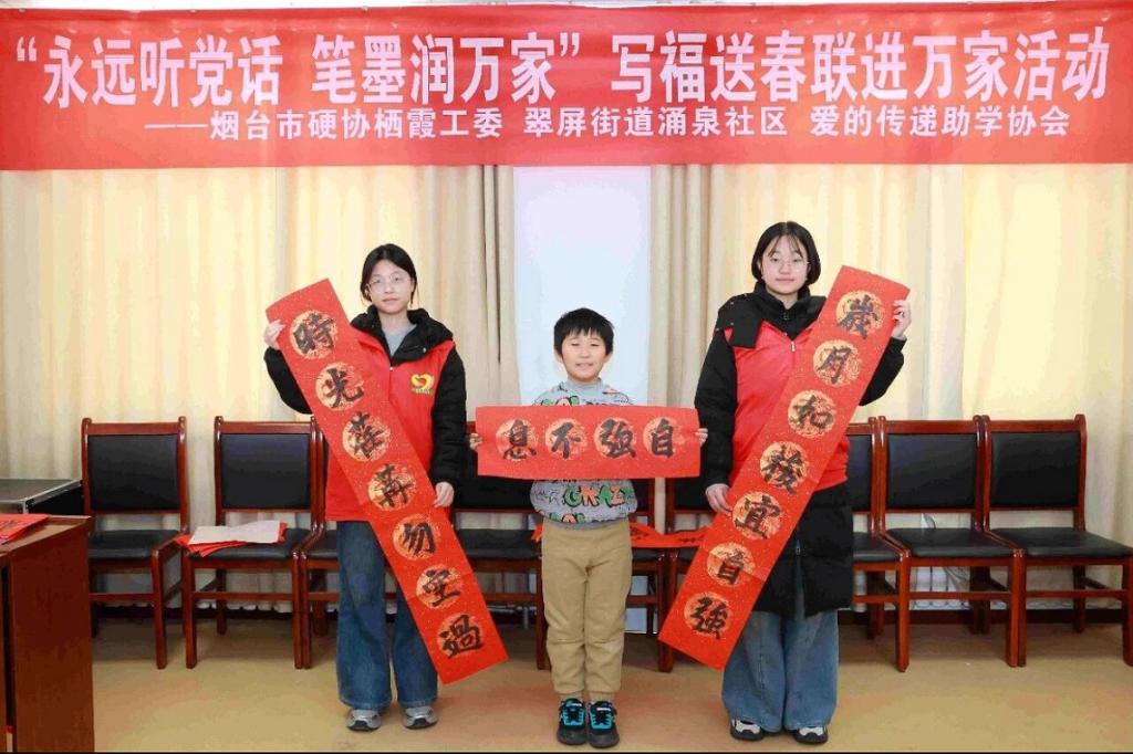 新春将至,年味渐浓,为传承中华优秀传统文化,营造欢乐祥和的新春氛围,幸运飞艇 “河韵承千古 青衿履新程”社会实践队于2026年2月6日走进栖霞市涌泉社区,联合烟台市硬笔书法家协会栖霞工委共同举办“永远听党话,笔墨润万家”写福送春联进万家主题文化志愿服务活动。实践队员以笔墨为媒,与书法家、社区青少年同台挥毫,开展教学互动、送福入户等实践活动,将新春祝福与文化暖意送到社区群众身边,用青春力量让传统年俗在基层焕发光彩。