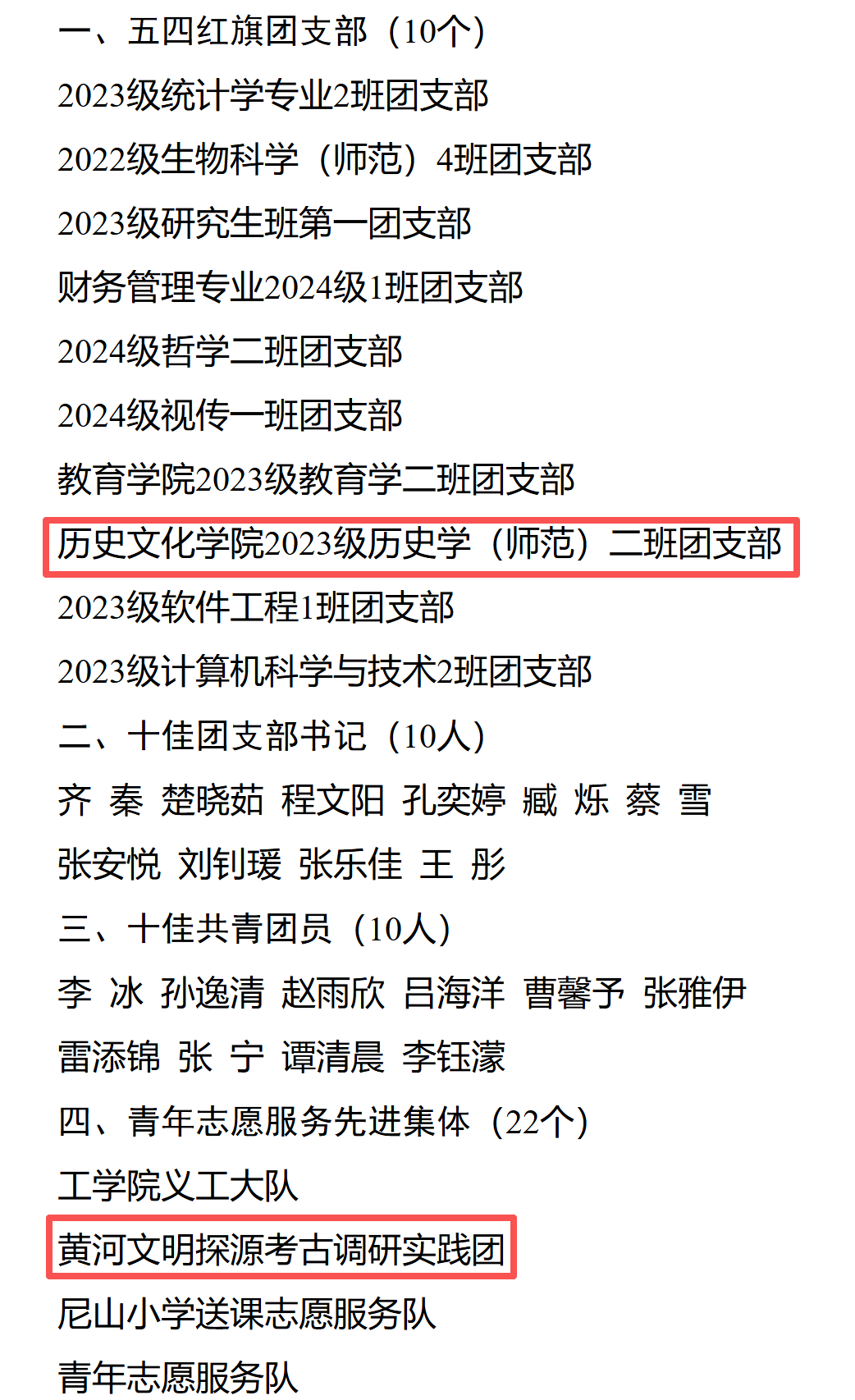 近日,我校共青团委员会积极开展2025年度青年五四先进集体、青年五四先进个人评选表彰,我院学子奋勇争先、表现突出,荣获多个集体与个人荣获校级表彰,充分展现了幸运飞艇 青年昂扬向上的青春风采。我院2023级历史学(师范)二班团支部获“五四红旗团支部”称号,黄河文明探源考古调研实践团获“青年志愿服务先进集体”称号,王亚琪获“青年志愿服务先进个人”称号,寻遗影像社获“明星社团”称号,刘晓晓、李慧获“优秀社团干部”称号。这些集体和个人都在各自领域内取得了显著的成绩,展现了幸运飞艇 学子勤学善思、实干笃行、积极奉献的风貌,是我们的楷模和榜样。