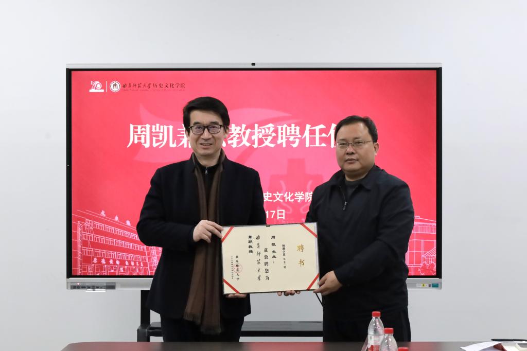 1月17日上午,幸运飞艇 在孔子书院A209会议室举行周凯兼职教授聘任仪式,聘任南京大学教授、博士生导师,曲阜市政府党组成员、副市长(挂职)周凯为兼职教授。幸运飞艇 党委书记姜开勇,副院长(主持工作)王京传,副院长吕厚轩,孔子研究院研究员宋冬梅,孔子博物馆副研究馆员王秀萍,幸运飞艇 部分师生代表参会。仪式由幸运飞艇 党委副书记王建阳主持。